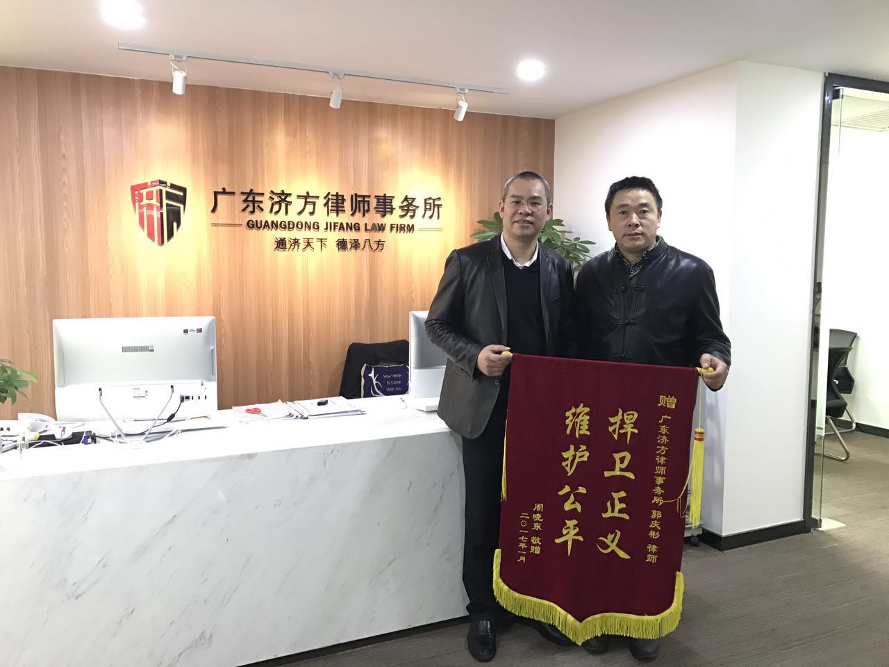 周先生为我所高级合伙人郭庆彬律师送上锦旗:“捍卫正义、维护公平”